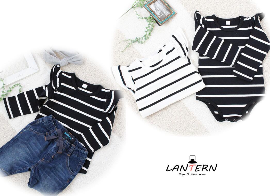 再入荷【肩フリルボーダー ロンパース】即納品 カバーオール 赤ちゃん ストライプ ロンパース ベビー 女の子 赤ちゃん インナー 韓国子供服 70 80